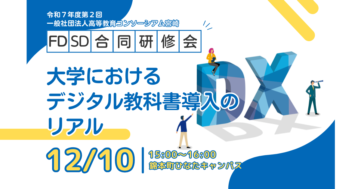 EVENT 全て 大学生 高校生・保護者 教職員 企業・一般 教職員 令和7年度第2回FD・SD合同研修会(12/10)~大学におけるデジタル教科書導入のリアル:現場で起きた成果と課題~ その他のイベント企業・一般教職員 令和8年度「公募型卒業研究テーマ事業」テーマ募集! 大学生高校生・保護者 発想力を鍛える特別プログラム「Ideation Factory」 大学生 第9 3 回宮崎大学イブニングセミナー 企業・一般大学生教職員高校生・保護者 第6回 宮崎・学生ビジネスプランコンテスト~決勝プレゼンテーション~ 大学生高校生・保護者 「みやざき未来研究所」学生限定「企画会議」という名の“こうりゅうかい” 大学生高校生・保護者 発想力を鍛える特別プログラム「Ideation Factory」 大学生 第9 3 回宮崎大学イブニングセミナー 企業・一般大学生教職員高校生・保護者 第6回 宮崎・学生ビジネスプランコンテスト~決勝プレゼンテーション~ 大学生高校生・保護者 「みやざき未来研究所」学生限定「企画会議」という名の“こうりゅうかい” 企業・一般大学生教職員高校生・保護者 「みやざき未来研究所」第4回『世界一のパティシエを魅了する宮崎食材の世界』 オープンキャンパス情報企業・一般大学生教職員高校生・保護者 【申込期間延長!】高等教育コンソーシアム宮崎シンポジウム ~高校・大学・社会で育てる宮崎の地域活性化人材~(みやざき進学フェス) 大学生高校生・保護者 発想力を鍛える特別プログラム「Ideation Factory」 企業・一般大学生教職員高校生・保護者 第6回 宮崎・学生ビジネスプランコンテスト~決勝プレゼンテーション~ 大学生高校生・保護者 「みやざき未来研究所」学生限定「企画会議」という名の“こうりゅうかい” 企業・一般大学生教職員高校生・保護者 「みやざき未来研究所」第4回『世界一のパティシエを魅了する宮崎食材の世界』 オープンキャンパス情報企業・一般大学生教職員高校生・保護者 【申込期間延長!】高等教育コンソーシアム宮崎シンポジウム ~高校・大学・社会で育てる宮崎の地域活性化人材~(みやざき進学フェス) その他のイベント企業・一般大学生教職員高校生・保護者 公開講演会「カウンセラーの仕事と資格取得までの道のり」 教職員 令和7年度第2回FD・SD合同研修会(12/10)~大学におけるデジタル教科書導入のリアル:現場で起きた成果と課題~ その他のイベント企業・一般教職員 令和8年度「公募型卒業研究テーマ事業」テーマ募集! 企業・一般大学生教職員高校生・保護者 第6回 宮崎・学生ビジネスプランコンテスト~決勝プレゼンテーション~ 企業・一般大学生教職員高校生・保護者 「みやざき未来研究所」第4回『世界一のパティシエを魅了する宮崎食材の世界』 オープンキャンパス情報企業・一般大学生教職員高校生・保護者 【申込期間延長!】高等教育コンソーシアム宮崎シンポジウム ~高校・大学・社会で育てる宮崎の地域活性化人材~(みやざき進学フェス) 大学生教職員 留学フェア その他のイベント企業・一般教職員 令和8年度「公募型卒業研究テーマ事業」テーマ募集! 企業・一般大学生教職員高校生・保護者 第6回 宮崎・学生ビジネスプランコンテスト~決勝プレゼンテーション~ 企業・一般大学生教職員高校生・保護者 「みやざき未来研究所」第4回『世界一のパティシエを魅了する宮崎食材の世界』 オープンキャンパス情報企業・一般大学生教職員高校生・保護者 【申込期間延長!】高等教育コンソーシアム宮崎シンポジウム ~高校・大学・社会で育てる宮崎の地域活性化人材~(みやざき進学フェス) その他のイベント企業・一般大学生教職員高校生・保護者 公開講演会「カウンセラーの仕事と資格取得までの道のり」 企業・一般大学生教職員高校生・保護者 宮崎大学日本語教育シンポジウム2025「AI×日本語教育×CEFR」 すべてのイベント PICKUP 高等教育コンソーシアム宮崎について 入試・オープンキャンパス情報 公開講座・その他講座等 INFORMATION 2025.10.24 ご案内 全国体育系大学学長・学部長会シンポジウム開催のご案内(大学地域コンソーシアム鹿児島) 2025.10.15 ご案内 第23回高大連携教育フォーラム『探究的な学びが高大にもたらすもの~高大連携の「モヤモヤ」に迫る~』(大学コンソーシアム京都) 2025.10.10 ご案内 FD・SDセミナー「学修成果の把握・可視化のためのアンケート設計」 (大学コンソーシアムひょうご神戸) すべての記事を見る