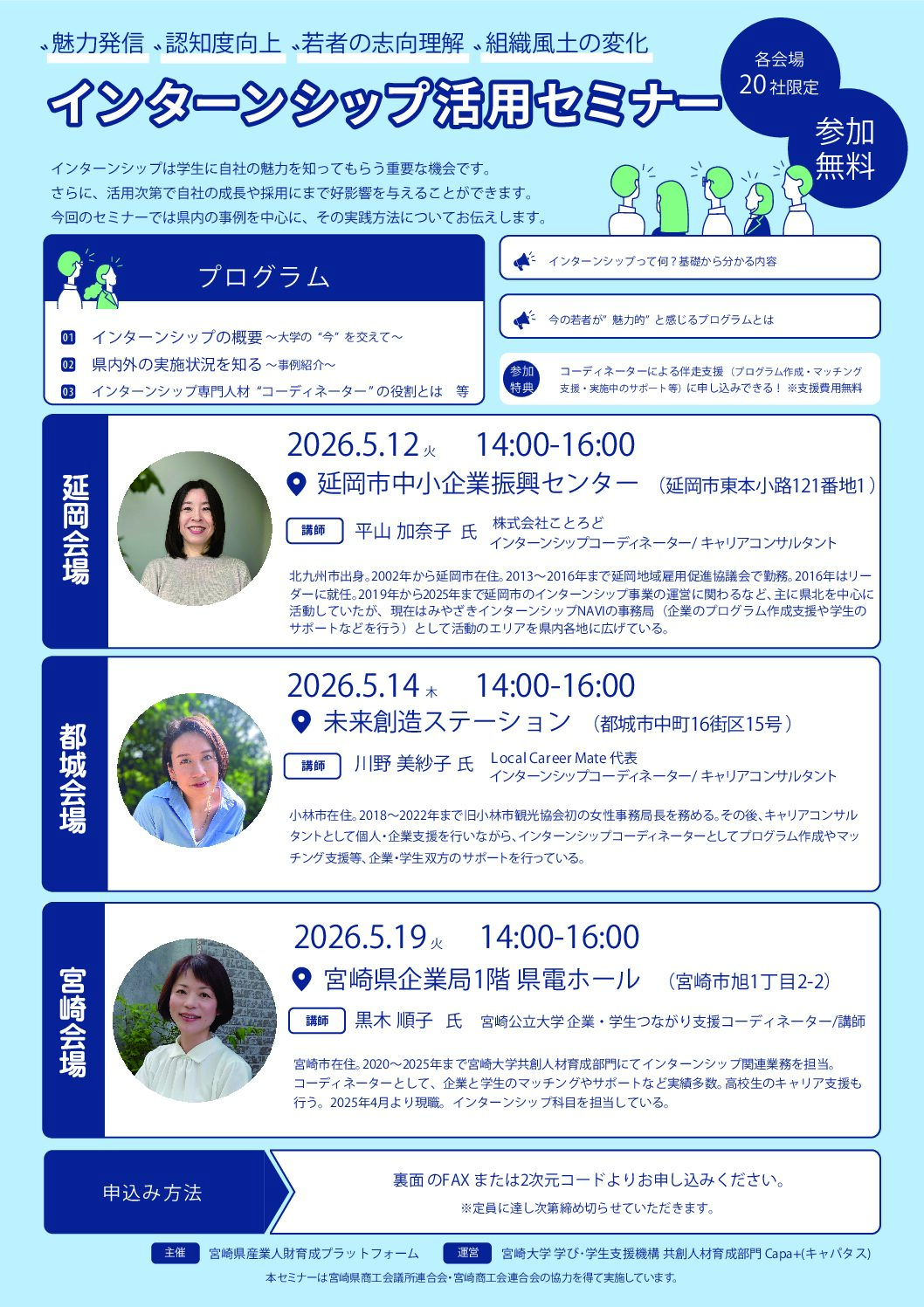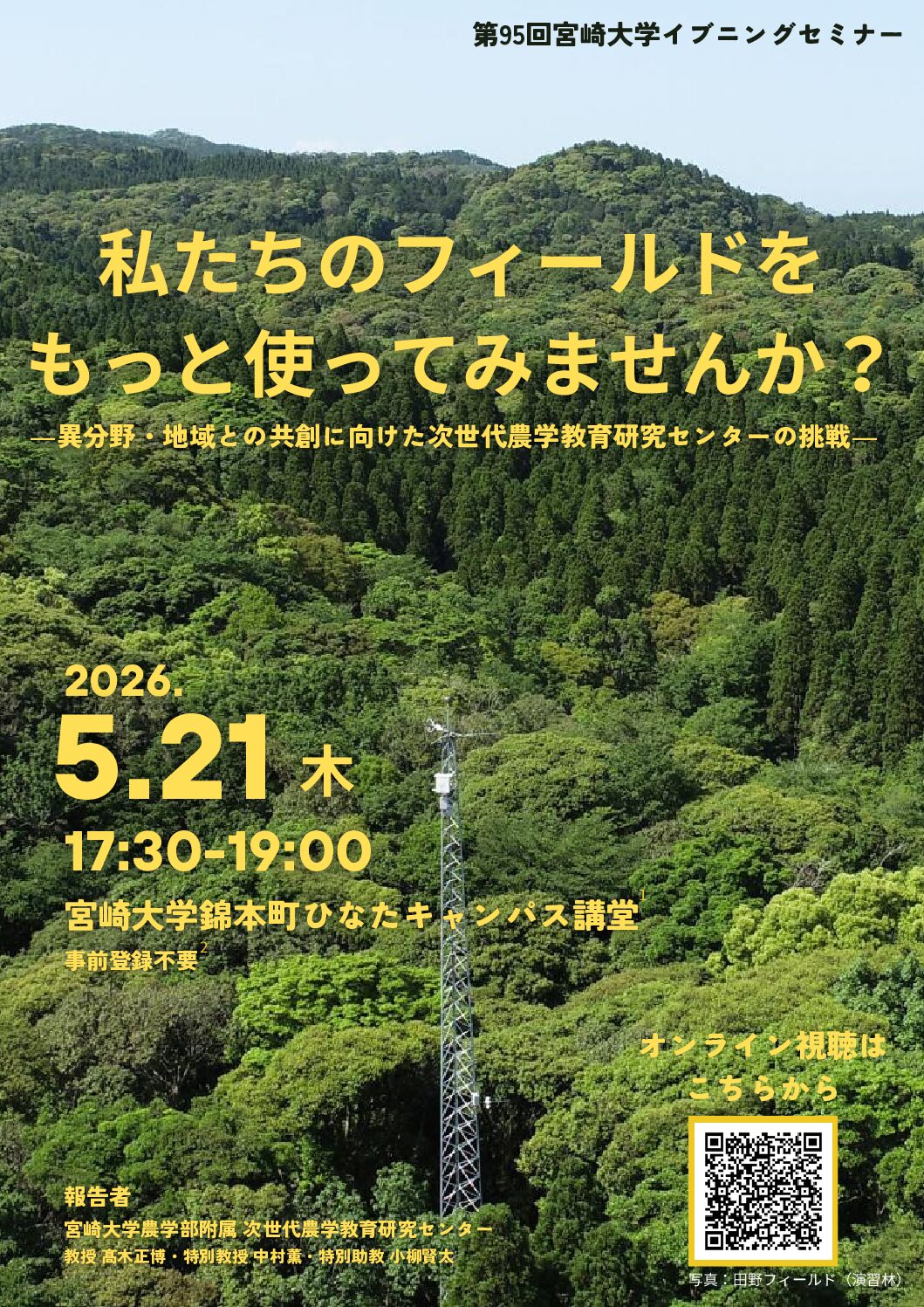EVENT 全て 大学生 高校生・保護者 教職員 企業・一般 その他のイベントまちなかキャンパス情報企業・一般大学生教職員 令和8年度シンポジウム「地域とともに創る高等教育の未来」(4/17) インターンシップ企業・一般 インターンシップ活用セミナー 企業・一般大学生教職員高校生・保護者 ひなた学び塾「命を紡ぐ、知を繋ぐ~半世紀の医療実践から描く、人間と社会の未来地図~」 企業・一般大学生教職員高校生・保護者 ひなた学び塾「地球温暖化を環境科学から考える」 その他のイベント企業・一般教職員高校生・保護者 「結局、探究ってなに?」 を考えるESDフォーラム開催 その他のイベント企業・一般大学生教職員高校生・保護者 令和7年度公募型卒業研究テーマ成果発表会(2/19) その他のイベントまちなかキャンパス情報企業・一般大学生教職員 令和8年度シンポジウム「地域とともに創る高等教育の未来」(4/17) 企業・一般大学生教職員高校生・保護者 ひなた学び塾「命を紡ぐ、知を繋ぐ~半世紀の医療実践から描く、人間と社会の未来地図~」 企業・一般大学生教職員高校生・保護者 ひなた学び塾「地球温暖化を環境科学から考える」 その他のイベント企業・一般大学生教職員高校生・保護者 令和7年度公募型卒業研究テーマ成果発表会(2/19) 企業・一般大学生教職員高校生・保護者 第94回宮崎大学イブニングセミナー「SFTSってどんな病気?~医師と獣医師が語る“健康”のつながり~」 企業・一般大学生教職員高校生・保護者 「みやざき未来研究所」第7回『ミヤダイがゾンビでワンダフル!!』 企業・一般大学生教職員高校生・保護者 ひなた学び塾「命を紡ぐ、知を繋ぐ~半世紀の医療実践から描く、人間と社会の未来地図~」 企業・一般大学生教職員高校生・保護者 ひなた学び塾「地球温暖化を環境科学から考える」 その他のイベント企業・一般教職員高校生・保護者 「結局、探究ってなに?」 を考えるESDフォーラム開催 その他のイベント企業・一般大学生教職員高校生・保護者 令和7年度公募型卒業研究テーマ成果発表会(2/19) 企業・一般大学生教職員高校生・保護者 第94回宮崎大学イブニングセミナー「SFTSってどんな病気?~医師と獣医師が語る“健康”のつながり~」 企業・一般大学生教職員高校生・保護者 「みやざき未来研究所」第7回『ミヤダイがゾンビでワンダフル!!』 その他のイベントまちなかキャンパス情報企業・一般大学生教職員 令和8年度シンポジウム「地域とともに創る高等教育の未来」(4/17) 企業・一般大学生教職員高校生・保護者 ひなた学び塾「命を紡ぐ、知を繋ぐ~半世紀の医療実践から描く、人間と社会の未来地図~」 企業・一般大学生教職員高校生・保護者 ひなた学び塾「地球温暖化を環境科学から考える」 その他のイベント企業・一般教職員高校生・保護者 「結局、探究ってなに?」 を考えるESDフォーラム開催 その他のイベント企業・一般大学生教職員高校生・保護者 令和7年度公募型卒業研究テーマ成果発表会(2/19) 企業・一般大学生教職員高校生・保護者 第94回宮崎大学イブニングセミナー「SFTSってどんな病気?~医師と獣医師が語る“健康”のつながり~」 その他のイベントまちなかキャンパス情報企業・一般大学生教職員 令和8年度シンポジウム「地域とともに創る高等教育の未来」(4/17) インターンシップ企業・一般 インターンシップ活用セミナー 企業・一般大学生教職員高校生・保護者 ひなた学び塾「命を紡ぐ、知を繋ぐ~半世紀の医療実践から描く、人間と社会の未来地図~」 企業・一般大学生教職員高校生・保護者 ひなた学び塾「地球温暖化を環境科学から考える」 その他のイベント企業・一般教職員高校生・保護者 「結局、探究ってなに?」 を考えるESDフォーラム開催 その他のイベント企業・一般大学生教職員高校生・保護者 令和7年度公募型卒業研究テーマ成果発表会(2/19) すべてのイベント PICKUP 高等教育コンソーシアム宮崎について 入試・オープンキャンパス情報 公開講座・その他講座等 INFORMATION 2026.03.17 ご案内 シティカレッジ単位互換事業(大学コンソーシアム石川) 2026.03.06 ご案内 SPORTECスポーツパフォーマンスフォーラム.in.鹿屋体育大学(大学地域コンソーシアム鹿児島) 2026.02.24 NEWS 令和7年度公募型卒業研究テーマ成果発表会を開催しました。 すべての記事を見る