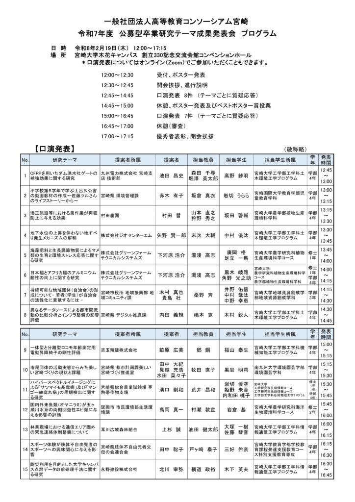 2月19日(木)宮崎大学木花キャンパスにて、令和7年度公募型卒業研究テーマ成果発表会を開催し、184名(内オンライン36名)の方々にご参加いただきました。